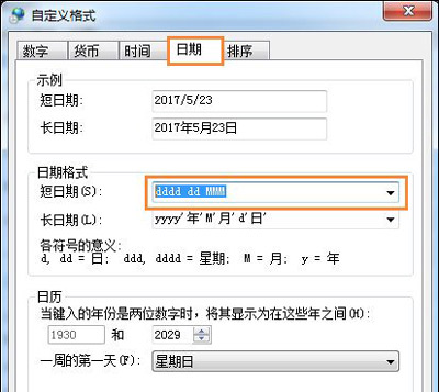4、在自定义格式窗口中,切换到“日期”选项卡,在日期格式栏修改:短日期(S )下拉框中输入“dddd dd MMM”。当然,dddd,dd,MMM的顺序可以调换。顺序不同,显示结果不同。