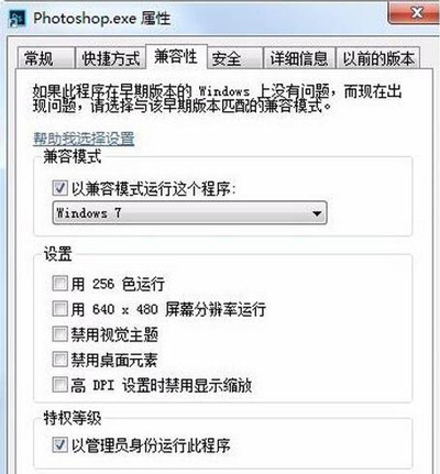3、右击PS的图标,找到属性--》兼容性--》以兼容模式运行该程序,选择windows7,并以管理员模式运行该程序。