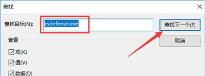 6、在搜索框中搜索【rsdefense.exe】 ,将找到的所有项或值都删除,然后重启计算机即可解决问题。