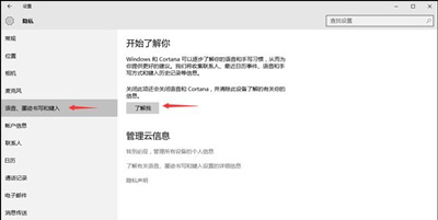 5、打开开始菜单-设置-隐私,找到“语音、墨迹书写和键入选项”,将“开始了解你”处关闭,这样小娜就被彻底关闭啦。