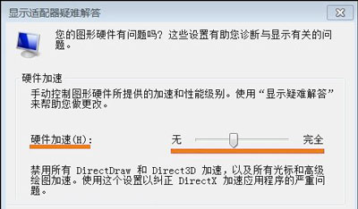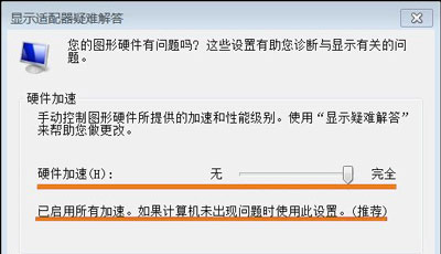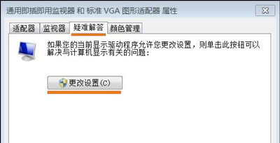 4、现在弹出了一个新的小窗口在上面切换到【疑难解答】选项卡然后窗口上点击【更改设置】按钮即可打开硬件加速窗口通过调整滑块来对硬件进行加速了。