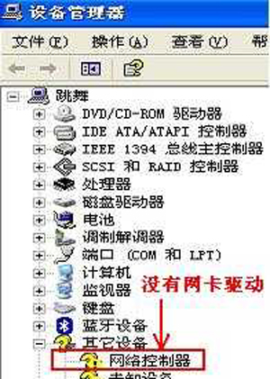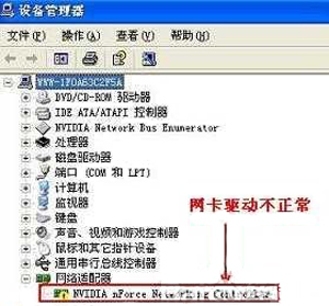 1.右键点击“我的电脑”选择“属性”——》弹出的“系统属性”中选择“硬件”选项卡——》点击“设备管理器”——》在弹出的“设备管理器”中查看“网络适配器”前面是否出现感叹号!,或者“网络控制器”前面有个问号?,假如出现问号或感叹号,这说明网卡驱动不正常或根本就没有安装网卡驱动;