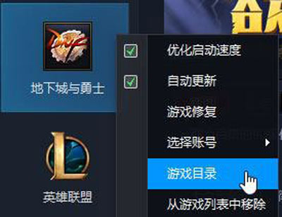 1、打开地下城与勇士的客户端所在路径,如果使用TGP的用户可以通过在左侧游戏列表中将鼠标移动到地下城与勇士的图标上,此时会出现一个 ↓ 的箭头点击该箭头,点击【游戏目录】即可;