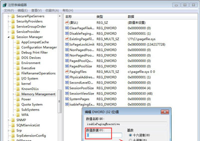 3、在右侧找到“isablePagingExecutive”值,没有的就新建一个,双击打开编辑窗口,将“数值数据设置为“0”,点击确定;