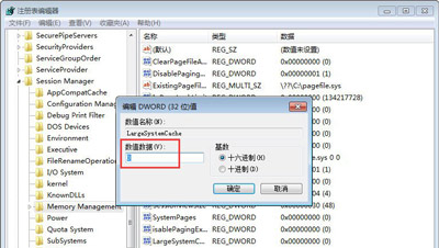 4、在右侧找到“LargeSystemCache”值,没有的就新建一个,双击打开编辑窗口,将“数值数据”设置为“0”,点击确定,重新启动电脑;