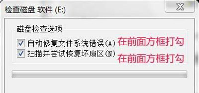 5、弹出检查磁盘窗口,我们在磁盘检查选项的两项前面的小方框内都打上勾,再点击:开始(S);