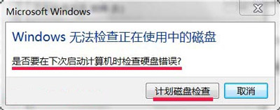 6、如果出现:Windows无法检查正在使用中的磁盘,是否要在下次启动计算机检查硬盘错误?我们就点击:计划磁盘检查,重新启动计算机。