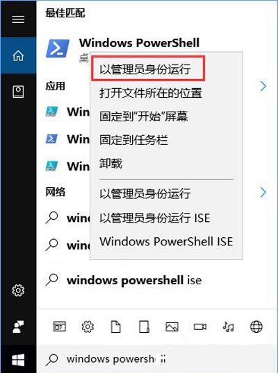 2、在Cortana搜索框输入windows powershell,鼠标右击windows powershell以管理员运行,复制粘贴以下命令运行。