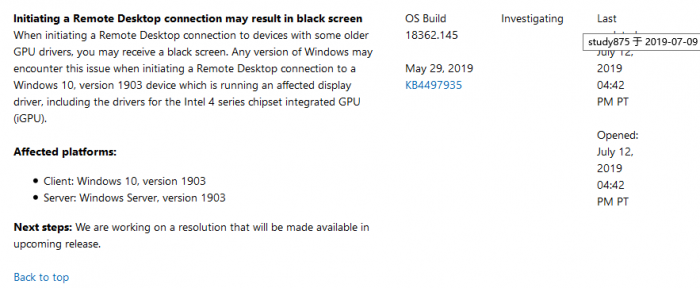 indows 10 May 2019(win10 1903)功能更新日前被爆存在BUG,导致使用远程桌面时候出现黑屏问题。本周早些时候,一位微软工程师在微软社区论坛上承认了这个问题,并解释说修复工作已在进行中。今天在Windows更新Dashboard更新的一则贴子中,微软承认正在制作这个问题的修复补丁,并确认Windows 10 May 2019(Version 1903)功能更新和Windows Server Version 1903均存在这个问题。
