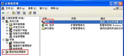 2、在“管理”窗口中,选取“服务和应用程序”扩展项目下的“服务”选项;
