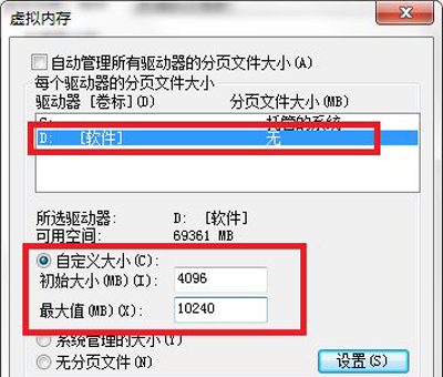 5、取消“自动管理所有驱动器的分页文件大小”,选择DNF安装目录,选择“自定义大小”,初始大小设置为“4096”,最大值设置为“10240”,点击确定,然后根据系统提示重启电脑。