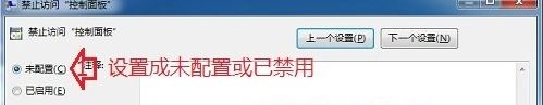 第三步、在禁止访问“控制面板”窗口,打开编辑后,将其设置为“未配置”或“已禁止”,然后打开“确定”便可。