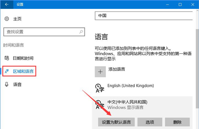 3、在语言界面左侧点击【区域和语言】选项,在右侧区域和语言下方选中 中文,点击【设为默认语言】即可!