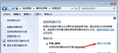 2、进入电源选项以后,在如下图所示的蓝点项后面,打开“更改计划设置”,如下图所示。