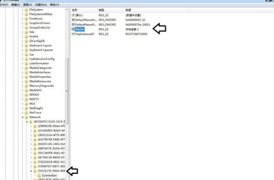 4、小编这里通过查找进入了“HKEY_LOCAL_MACHINESYSTEMControlSet001ControlNetwork{4D36E972-E325-11CE-BFC1-08002BE10318}{7411E17E-59D4-4BBE-A4F3-938931C9F8C0}Connection”这个目录,在右侧的“Name”字符串值的数值就是“本地连接 2”;