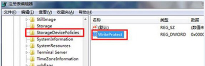 2、在打开的注册表编辑器窗口中依次展开“HKEY_LOCAL_MACHINESYSTEMCurrentControlSetControlStorageDevicePolicies”并找到StorageDevicePolicies右侧的WriteProtect键值;