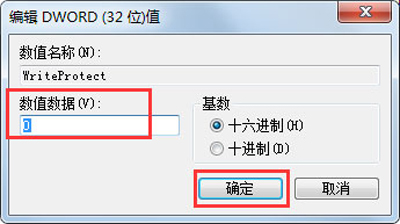 3、然后双击鼠标左键“WriteProtect”键,在弹出的窗口中将,数值数据设置为“0”,然后点击“确定”按钮即可。