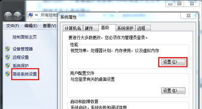 1、以Win7为例,在电脑桌面右击“计算机”,弹出菜单栏之后点击“属性”,之后会进入系统信息界面,我们继续点击“高级系统设置”,弹出系统属性界面,切换至“高级”选项卡中,再点击“设置”,如下图所示: