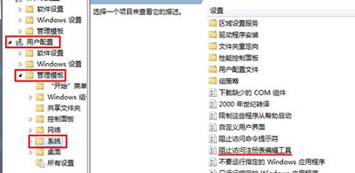 2.接下来,咱们在组策略编辑器窗口的左侧菜单栏中依次点击展开用户配置-管理模块-系统,然后在右侧窗口中找到“阻止访问注册表编辑工具”选项并双击打开。