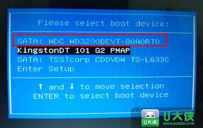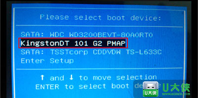 使用键盘上的上下方向键,将光标移动选择到的地方显示为USB启动的选项,就比如这里小编的U盘信息是“KingstonDT 101 G2 PMAP”