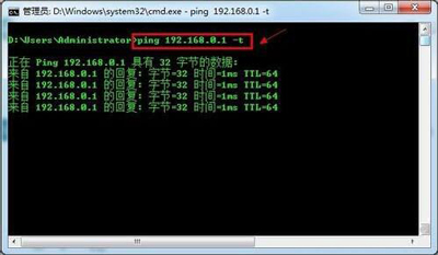 6、测试网关。打开“运行”对话框,输入命令“CMD”打开MSDOS窗口。然后在窗口中输入命令“ping 192.168.1.1 -t”,如果信息显示成功接收到数据,则说明默认网关配置成功。如图所示: