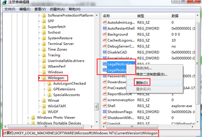 解决方法:使用组合快捷键win键+r键打开运行窗口,输入“regedit”按回车确认打开注册表编辑器,然后依次展开HKEY_LOCAL_MACHINESoftwareMicrosoftWindows NT CurrentVersionWinlogon,接着在右侧窗口找到并删除“LegalNoticeCaption”和“LegalNoticeText”这两个字符串。如下图所示
