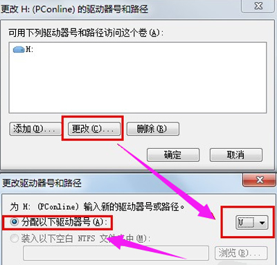 4.在新出现的界面中点击“更改”,在弹出的窗口中选择自己想要的盘符号。点击确认。
