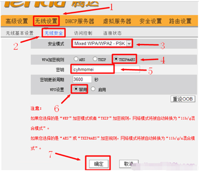 3、点击“无线设置”—“无线安全”——》“安全模式”建议用户选择:WPA2-PSK、Mixed WPA/WPAS2-PSK这2项——》“WPA加密规则”建议选择:TKIP&AES——》“密钥”建议设置为字母大小写、数字的组合——》“密钥更新周期”保持默认值——》“WPS设置”选择:禁用——》点击“确定”。