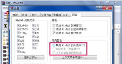 4、在综合下面,找到“外壳整合”这一项,本来下面三项,在默认状态下是勾选的,可当前并没有勾选,所以右键中就没有WinRAR菜单了;
