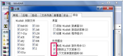 5、若要在右键中显示“WinRAR”菜单,将外壳整合下面这三项勾选,按确定即可。提示:有时这三项是勾选的,但也没有在右键中显示WinRAR菜单,则先把这三项勾选去掉,退出,再重新启动WinRAR程序,在综合中,重新勾选上,有许有效。