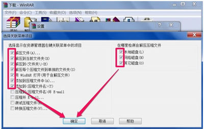 7、在选择关联菜单项目窗口,选择需要添加到右键菜单的项目,按“确定”,再去右键压缩文件,在右键菜单中,就显示WinRAR菜单项了;