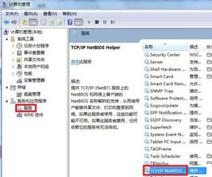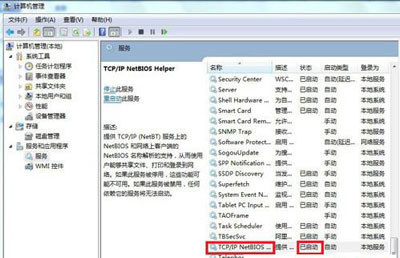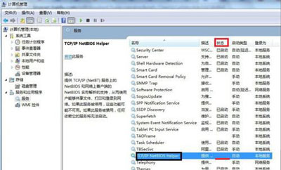 4、在右侧的服务列表中找到TCP/IP NetBIOS Helper这个服务,在状态栏中查看下是否已开启。下图表示未开启。