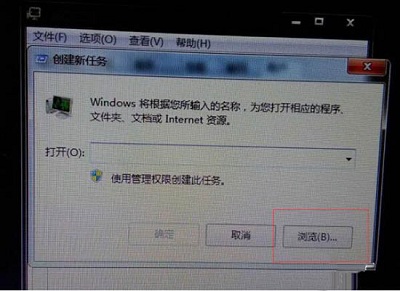 2、进入任务管理器弹出任务管理对话框,选择文件下的新建任务运行,在下面的打开中选择浏览;如图所示: