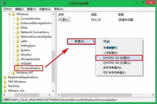 3、”Personalization“新建之后,在其右边的窗口里面右键”新建“-”DWORD(32位)值“,把这个数值改为”NoLockScreen“;如图所示: