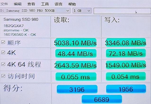 2、AS SSD Benchmark跑分为:3196/1956/6689分。软件下载>>