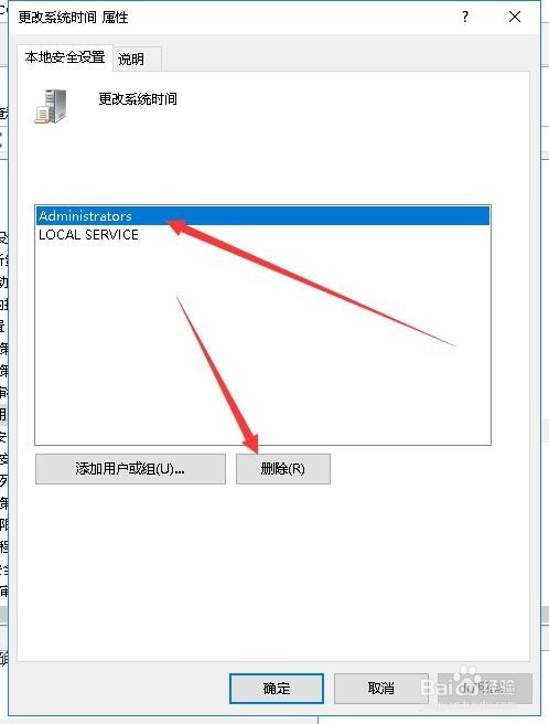 6:这时就会打开编辑窗口,在窗口中我们选中要删除的用户名,然后点击下面的“删除”按钮,这样该用户以后就无法再修改系统时间了。