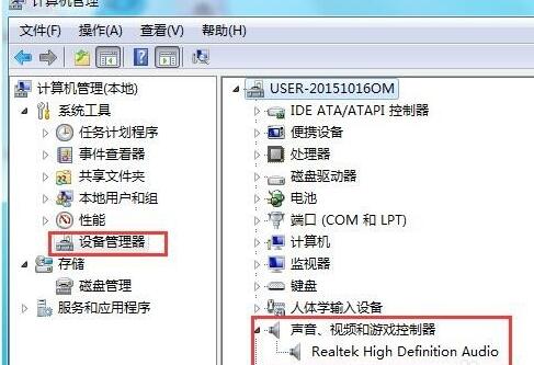 2、进入管理界面后依次找到“设备管理器”、“声音、视频和游戏控制器”,查看声卡驱动是否有黄色叹号,若有,请更新驱动。