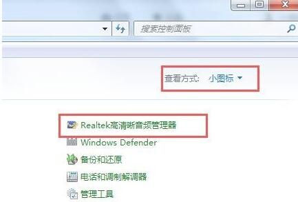 1、点击左下角“开始”按钮,找到“控制面板”并点击打开。查看方式更改为“小图标”,找到“Realtek高清晰音频管理器”并点击进入。