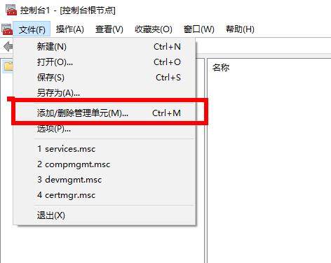 2、进入控制台1后点击“文件”选择“添加/删除管理单元”。