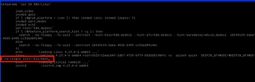 3、移动到这里后输入 rw single init=/bin/bash,然后再按“CTRL+X”来启动。