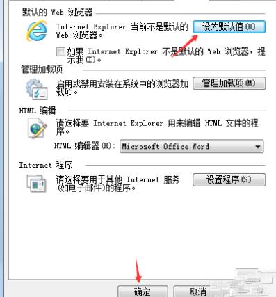 4、重置完成后,再次点击【设置】→【Internet选项】→点击【程序】→【设为默认值】→点击【确定】即可。
