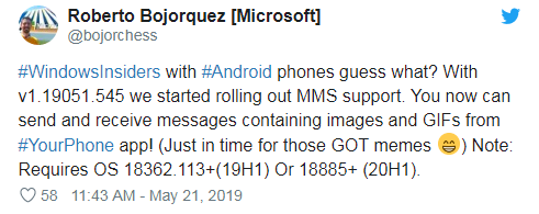 现在,Windows Insider 测试者们应该可以在慢速和发布预览(Slow / Release Preview Ring)通道接收到 18362.113 或更高版本的 Your Phone 应用更新。