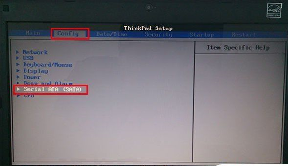 2、进入BIOS界面,选中Config选项卡,在展开的页面中选择Serial ATA (SATA)选项。