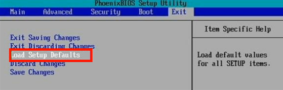 2、在打开的界面中找到并且选择【Exit】菜单下面的【Load Setup Defaults】选项回车,在打开的窗口选择【Yes】再次回车。