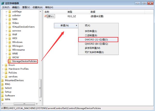 4、在新建的StorageDevicePolicies项右侧空白处右键点击“新建”选择“