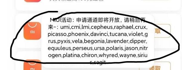 miui12适配机型:信息显示,“MIUI活动:申请通道即将开放,请稍后再来”后有很多英文字母,其实这些英文字母就是机型代号。