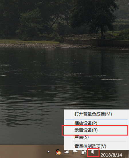 1、找到位于桌面右下角的小喇叭图标然后鼠标右键选择“录音设备”点击打开。