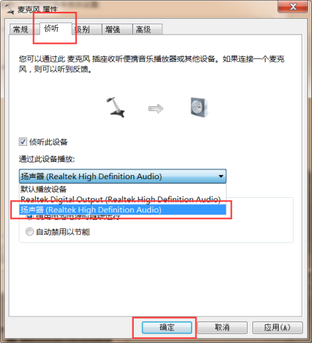3、找到如图的“侦听”选项卡,然后勾选“侦听此设备”单选框,然后选择通过音响来播放,点击页面底部“确定”按钮即可完成realtek高清晰音频管理器麦音响设置。