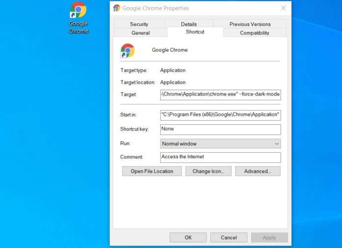 3.在目标字段下面,添加“--force-dark-mode”描述