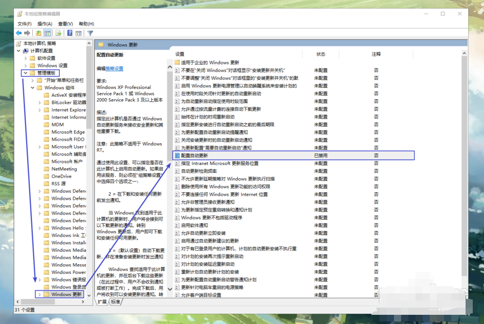 2、按照下面的图,依次展开“计算机配置”-“管理模板”-“Windows更新”,双击打开“配置自动更新”。